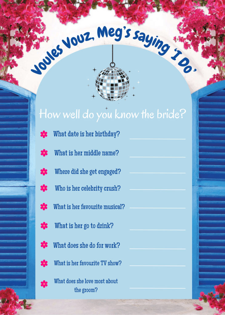 I searched high and low on Google Images and Etsy for some PG hen do game packs, but I just couldn’t find exactly what I needed. There’s a running theme with hen do games that leans heavily into the bride’s most intimate moments or embarrassing stories — and I knew our bride wouldn’t be comfortable with that. So, I took matters into my own hands and put my (very limited!) Canva skills to good use, creating a personalised pack of hen do games and activities. And let me tell you — they are a masterpiece. I don’t care what anyone says!