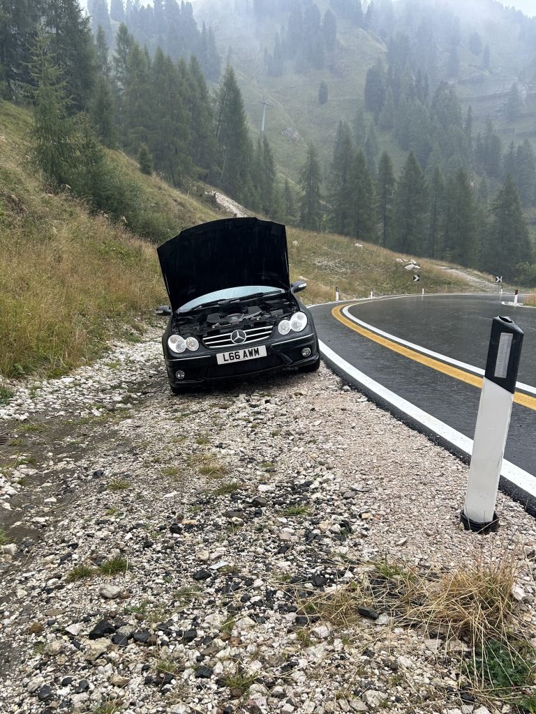 Our lovely Mercedes CLK AMG – my husbands pride and joy – had carried us over 900 miles from the UK to Italy without a hiccup. It was our trusty chariot for the happiest day of our lives – the happiest 3 weeks of our lives. But of course, at the main event, it decided it had had enough. Full on emotional breakdown. Hazards flashing, bonnet up, and a dramatic cloud of smoke flying from the engine. But let me tell you; I did. not. cry.