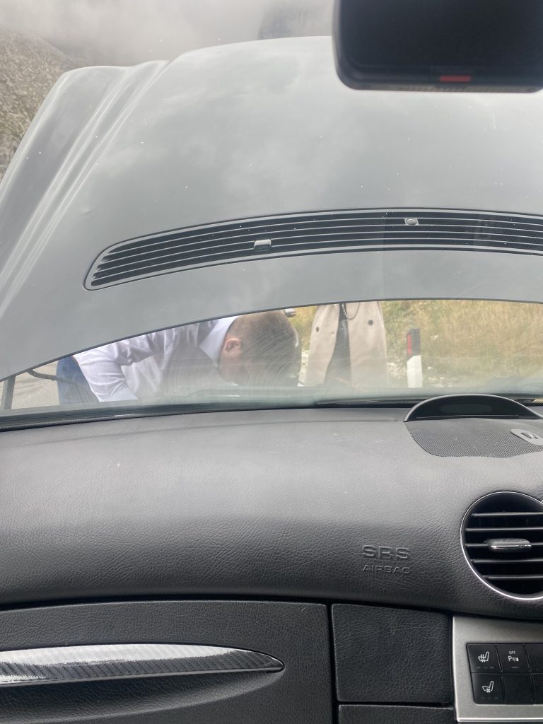 In a panic, Chris jumped out of the car and dove under the bonnet, channeling full Top Gear energy as he searched for the source of the problem. Meanwhile, I was frantically calling Jlenia and our photographer to turn around and come rescue us. I dropped them a Google Maps pin, and they were back down the mountain within minutes.